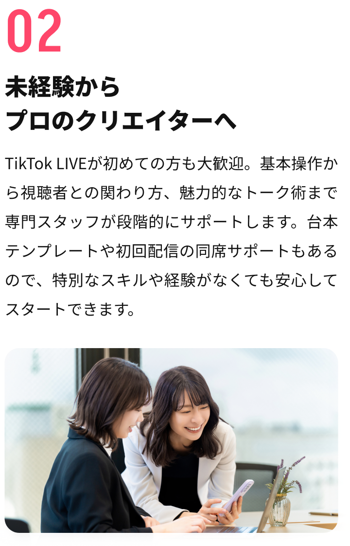 現在の生活スタイルやご希望をお聞きし、まずはどのように配信していくか等を相談していきましょう。TikTok LIVEクリエイターとしての可能性を一緒に検討します。